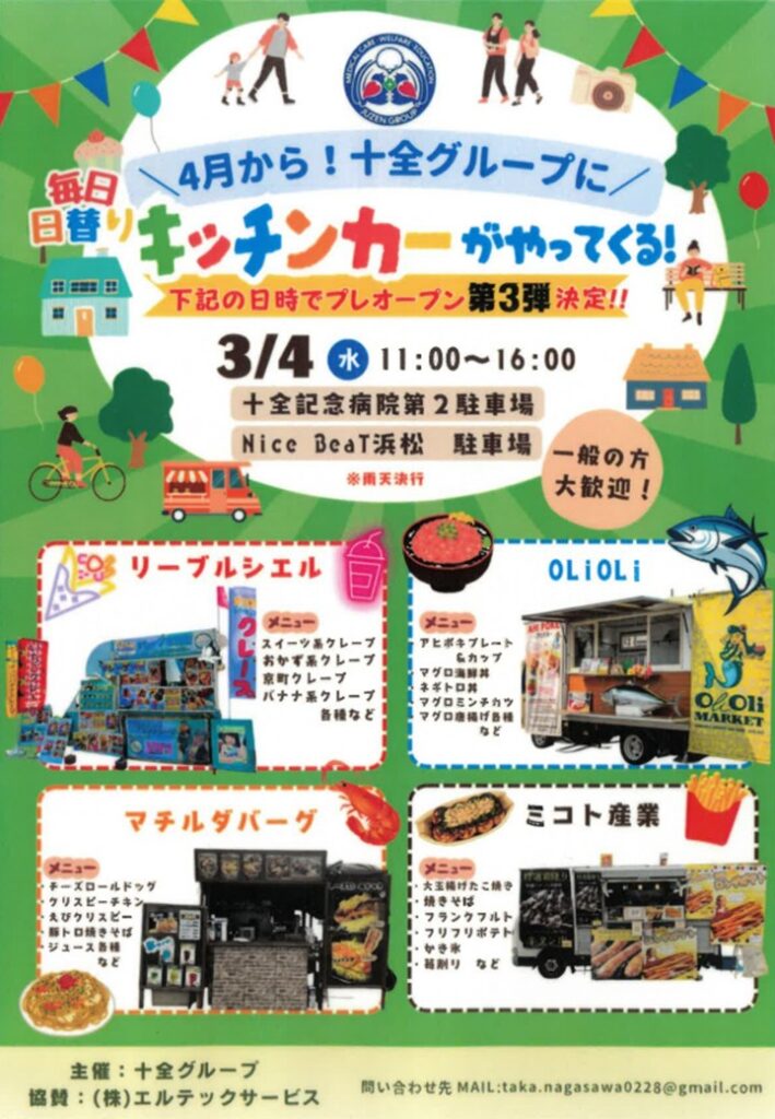 3月4日(水)11:00~16:00 ナイスビート浜松駐車場と十全記念病院第2駐車場にキッチンカーが来ます。